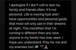 Δεν είναι προσωπικό. Η ζωή κινείται γρήγορα και έχω ευκαιρίες και προσωπικούς στόχους, που οι περισσότεροι θα δουν μόνο στα όνειρα τους τα βράδια. Ο αγώνας αυτός που τρέχω είναι διαφορετικός από κάθε άλλο είδους αγώνα, που ο οποιοσδήποτε στην οικογένεια μου έχει δει. Ελπίζω να καταλαβαίνετε. Προσευχηθείτε για εμένα και τους εχθρούς μου”.